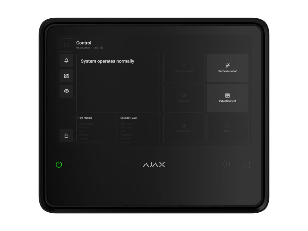 EN54 Fire Hub Jeweller je dotyková riadiaca a indikačná jednotka (CIE) navrhnutá na komplexnú správu systému požiarnej ochrany. Je ľahko inštalovateľná, jednoducho sa používa a vyžaduje len minimálnu údržbu. Vstavané komunikátory a plne bezdrôtové pripojenie zariadení umožňujú rýchle nasadenie systému a jeho pripojenie na monitorovacie stanice prostredníctvom aplikácií Ajax.