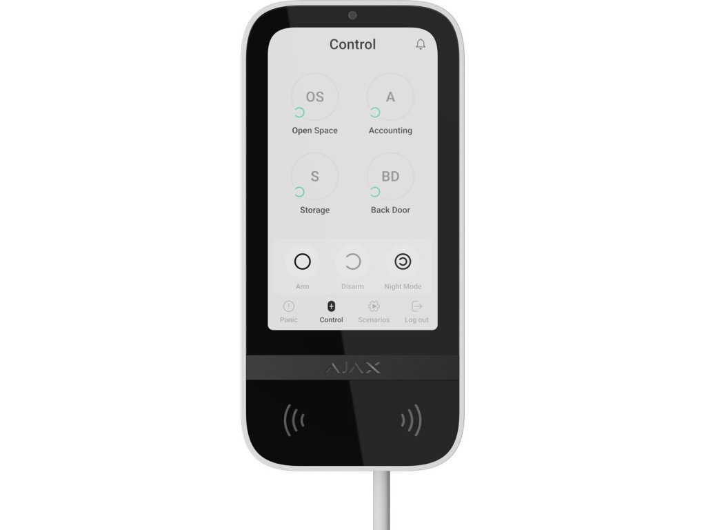 Dotyková obrazovka s uhlopriečkou 5 palcov poskytuje rýchly prístup k aktuálnemu režimu zabezpečenia skupiny. Aktivuje sa priblížením ruky a automaticky upravuje jas. Poskytuje zvukové upozornenia na poplachy, časové oneskorenia pri vstupe/výstupe a otvorenie dverí pri deaktivovaní systému. Hlasitosť je nastaviteľná v aplikáciách Ajax. Zobrazuje výsledky kontroly integrity systému a informuje o poruchách pri aktivácii zabezpečenia.
